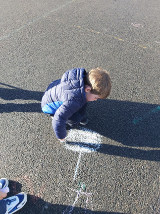 Junior Infants had great fun decorating the yard on Friday. We had paths for the Big Bad Wolf and several pictures of the Three Little Pigs as well as a hopscotch, letters, houses and even a centipede with 28 legs!